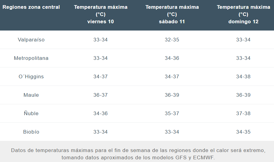Tal como se mencionó, la región del Maule sería la más afectada, donde tanto el sábado como el domingo podría bordear los 40°. Mientras que las regiones de O'Higgins y el Ñuble podrían llegar a alcanzar 38° el domingo. En cambio, en la región Metropolitana el día de más calor será el sábado, donde la temperatura llegaría a los 36°.