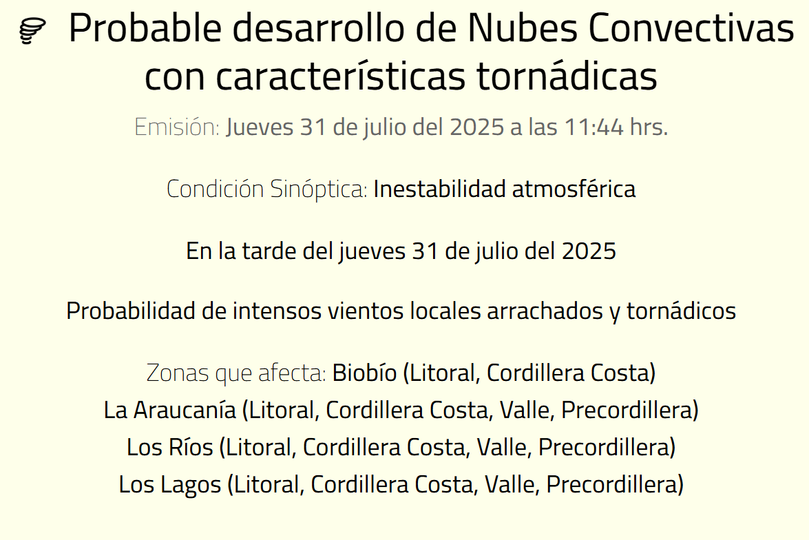 Aparte de este inminente peligro, la Dirección Meteorológica de Chile (DMC) anunció posibles tornados o trombas marinas en cuatro regiones del sur del país: Biobío, La Araucanía, Los Ríos y Los Lagos.