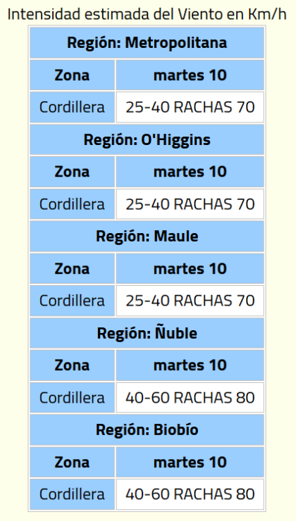 El organismo también detalló que para la tarde de martes se espera "viento normal a moderado" producto de un frente frío en las siguentes zonas del país: