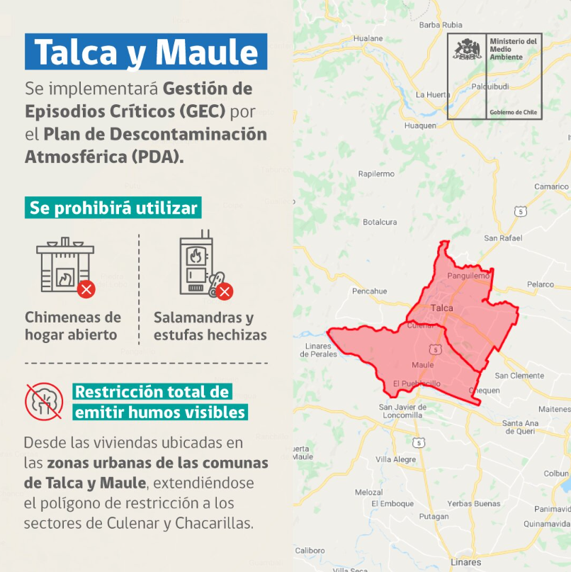 La medida regirá en la región del Maule, principalmente en las comunas de Talca y Maule. Se implementará la Gestión de Episodios Críticos (GEC) por el Plan de Descontaminación Atmosférica (PDA).