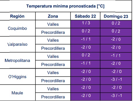 Un nuevo evento de heladas, el segundo de la presente temporada, afectará este fin de semana los valles de la zona central del país con temperaturas mínimas que podrían llegar a 3° bajo cero. Por lo mismo, la Dirección Meteorológica de Chile (DMC) emitió una alerta dirigida al sector agrícola por el frío extremo en sectores del interior de las regiones de Coquimbo, Valparaíso, Metropolitana, O’Higgins y Maule.
