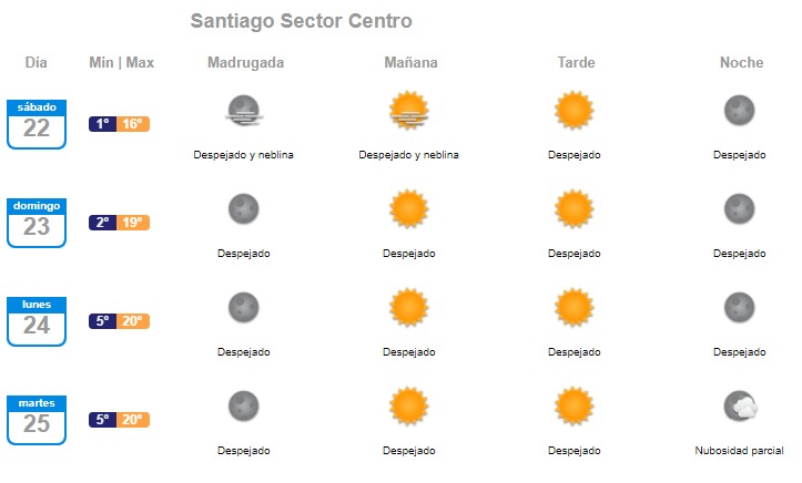 La estabilidad atmosférica provocará mala ventilación en los valles de la zona central. Recién el siguiente evento de precipitaciones en el centro-sur del país se avizora para mediados de la próxima semana, aunque a tantos días no es posible confirmarlo tampoco.