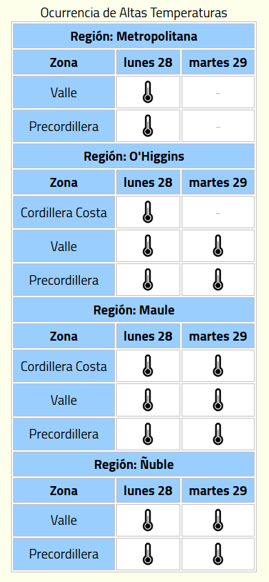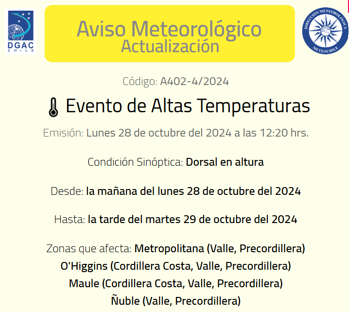 Ante eso, la Dirección Meteorológica de Chile emitió un aviso meteorológico por altas temperaturas para un total de cuatro regiones, vigente hasta este martes 29 de octubre.