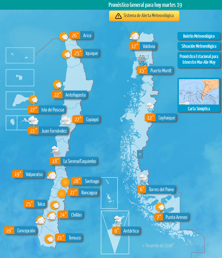 Dirección Meteorológica de Chile para este martes 19 de marzo en el resto del país:
