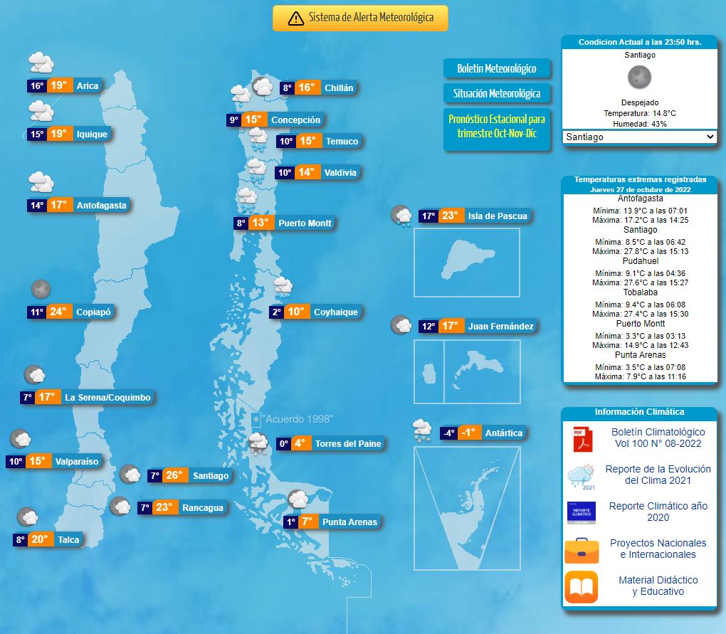 A continuación, te contamos cómo estarán las temperaturas durante este 28 de octubre obtenidas a través del sitio oficial de la Dirección Meteorológica de Chile.