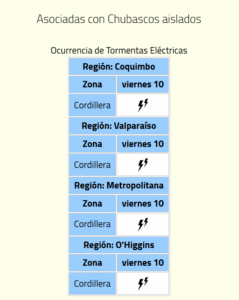 La Dirección Meteorológica de Chile informó que 4 regiones de la zona central presentan posibilidad de tormentas eléctricas con chubascos aislados. Estas son Coquimbo (cordillera), Valparaíso (cordillera), Metropolitana (cordillera) y O’Higgins (cordillera).