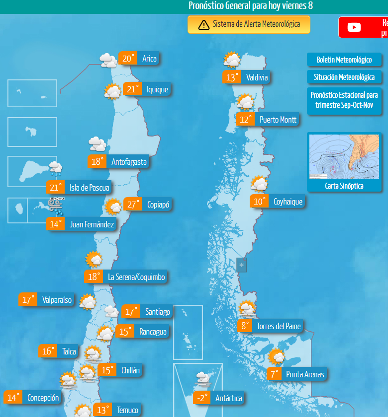 Dirección Meteorológica de Chile para este viernes 8 de septiembre en el resto del país: