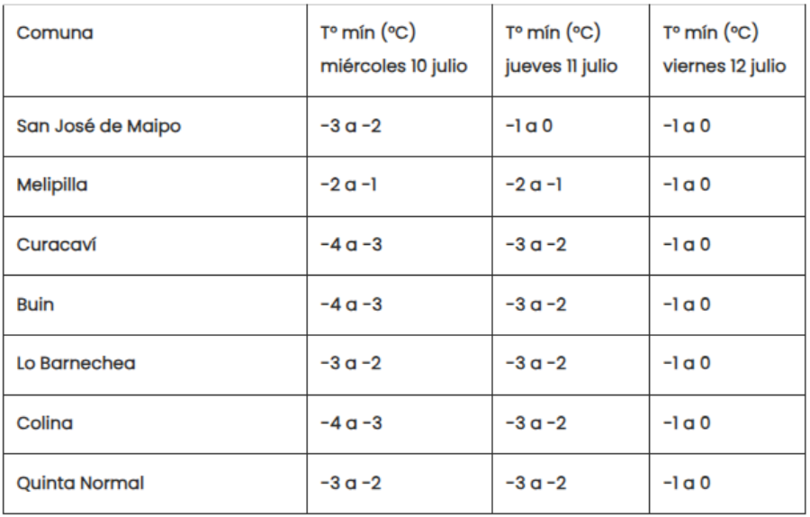 El jueves se estima que las temperaturas matutinas subirán levemente en las ciudades antes mencionadas con temperaturas mínimas que estarán cerca de los -3°. Misma situación para Lo Barnechea y Quinta Normal.