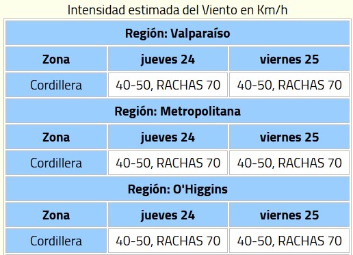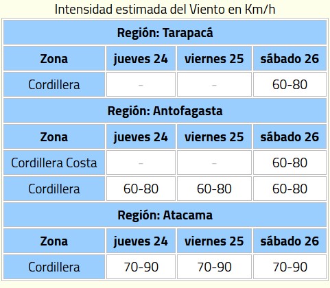Es en la región de Atacama donde se esperan los vientos más fuertes, con velocidades de entre 70 km/h a 90 km/h en la cordillera.