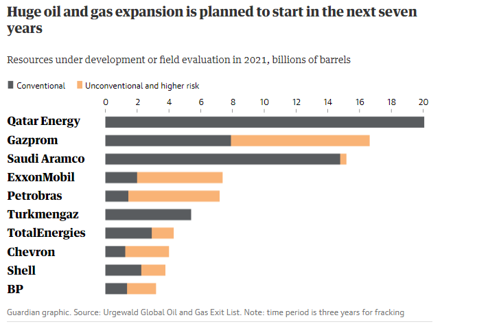 “Las empresas de combustibles fósiles más grandes del mundo están planeando en silencio decenas de proyectos de petróleo y gas de ‘bomba de carbono’ que impulsarían el clima más allá de los límites de temperatura acordados con impactos globales catastróficos”, reveló una investigación de The Guardian.