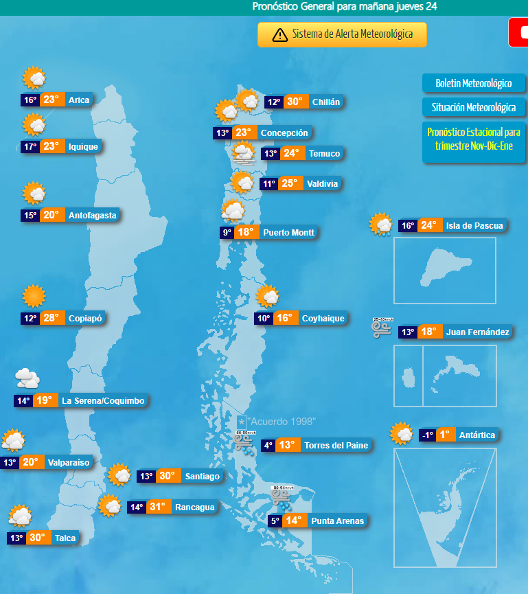 De acuerdo a la Dirección Meteorológica de Chile, este jueves 24 de noviembre la máxima será de 30°, con una mínima de 13°. A ratos se nublará para dar paso rápidamente al sol.