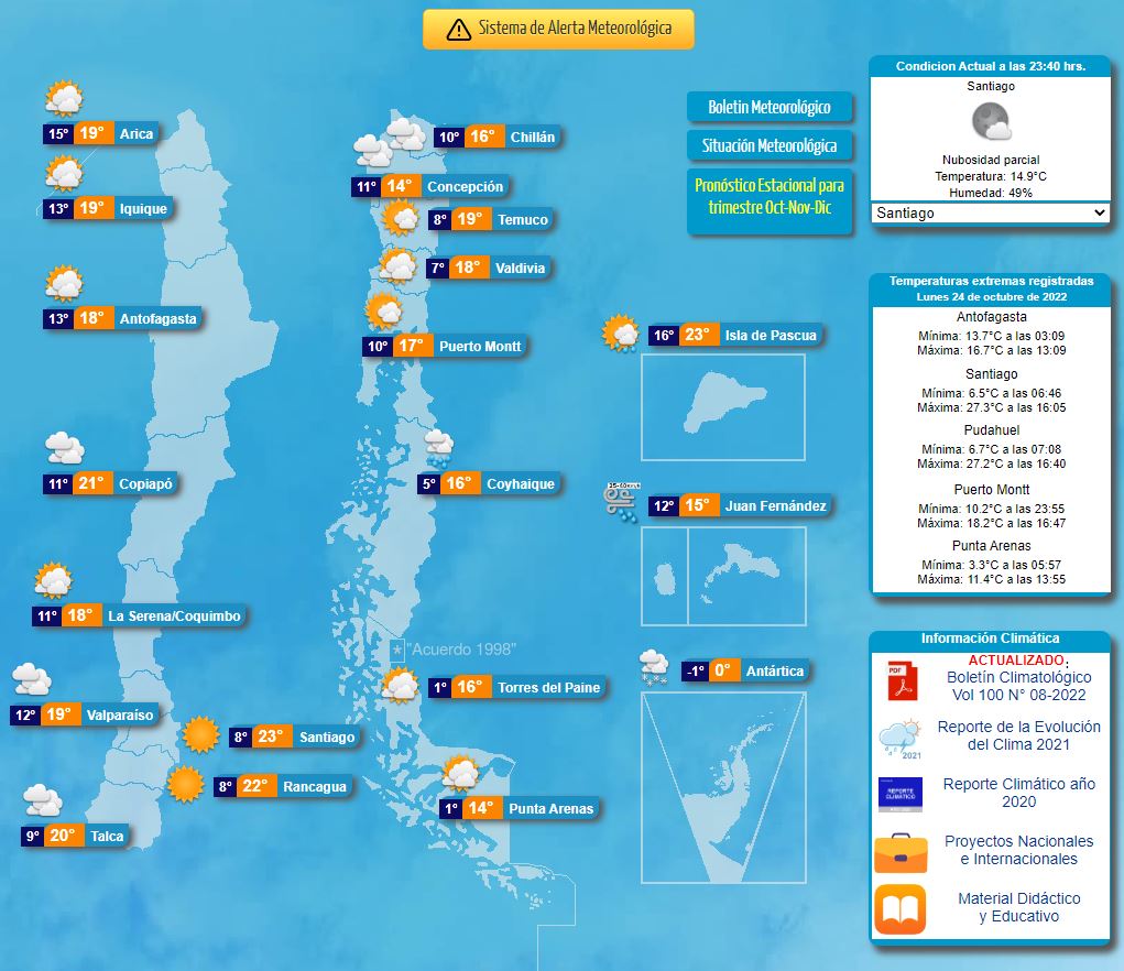 A continuación, te contamos cómo estarán las temperaturas durante este 25 de octubre obtenidas a través del sitio oficial de la Dirección Meteorológica de Chile.