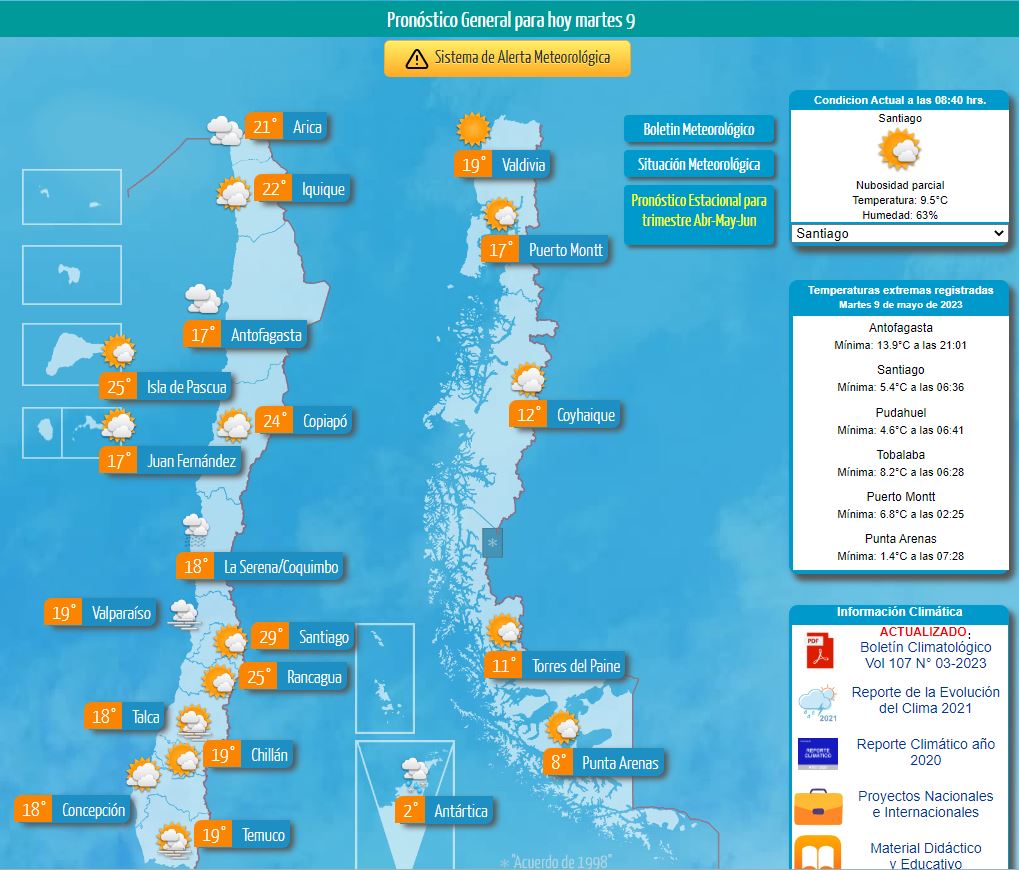 Finalmente, a modo de ejemplo, desde el portal de la DMC se informa que los termómetros llegarán a marcar hasta 29°C en la RM. Esto ocurrirá precisamente este martes, bajando luego a 27°C hasta el jueves, y regresando a los 29°C el viernes.