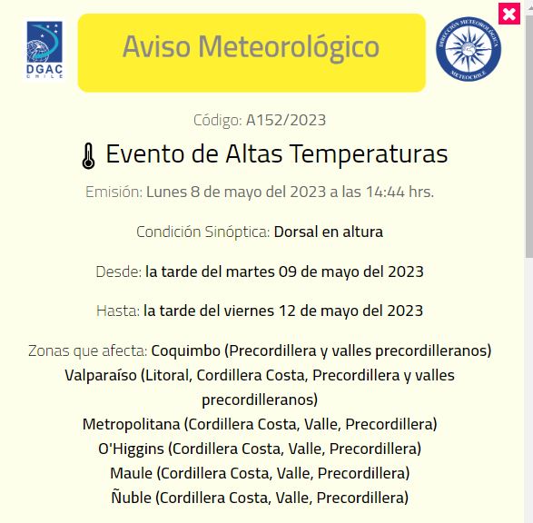 Asimismo, la zona en la que afectará este evento se extenderá desde Coquimbo, Valparaíso, Región Metropolitana, O'Higgins, Maule y Ñuble.