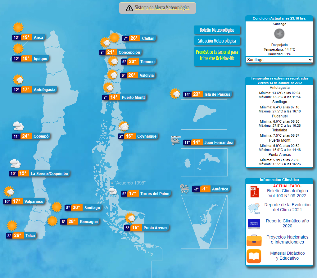 A continuación, te mostraremos cómo estarán las temperaturas durante este 15 de octubre, obtenidas a través del sitio oficial de la Dirección Meteorológica de Chile.