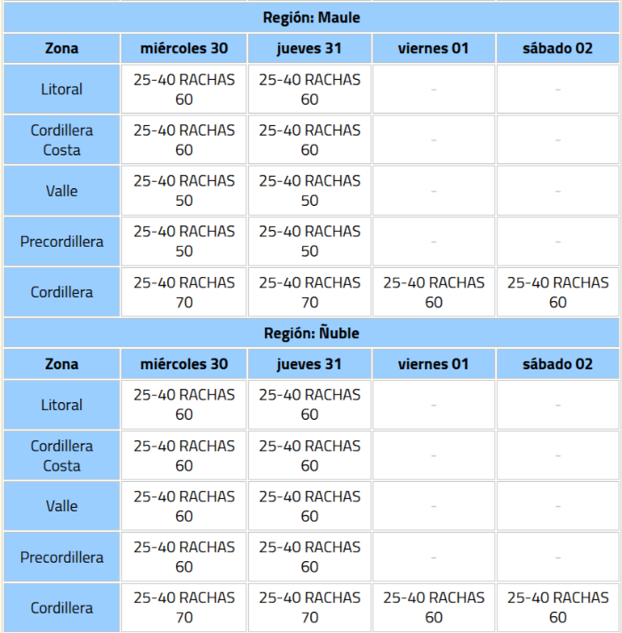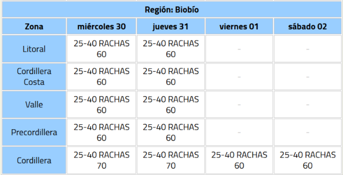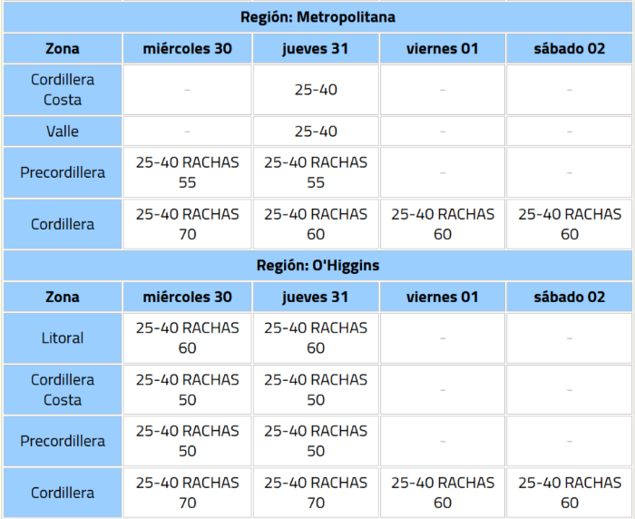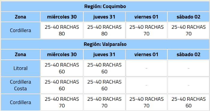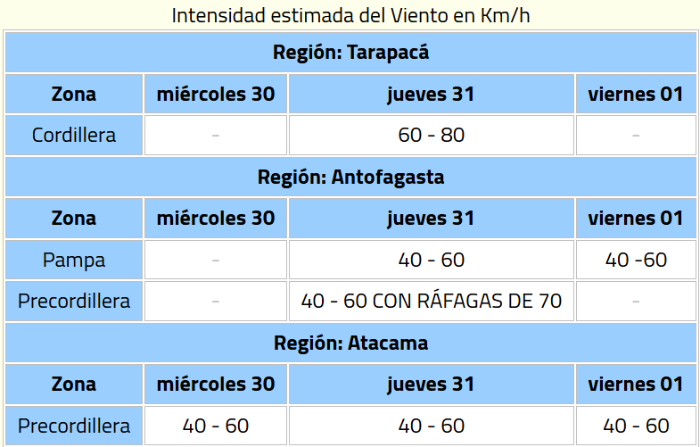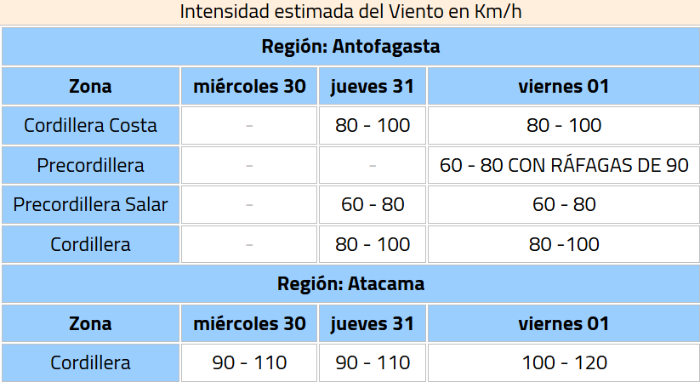 El fenómeno se registrará en sectores del litoral, la cordillera de la costa, el valle, precordillera y cordillera dependiendo de la zona. Antofagasta será la más afectada, con pronósticos de vientos de hasta 120 km/h en la cordillera.