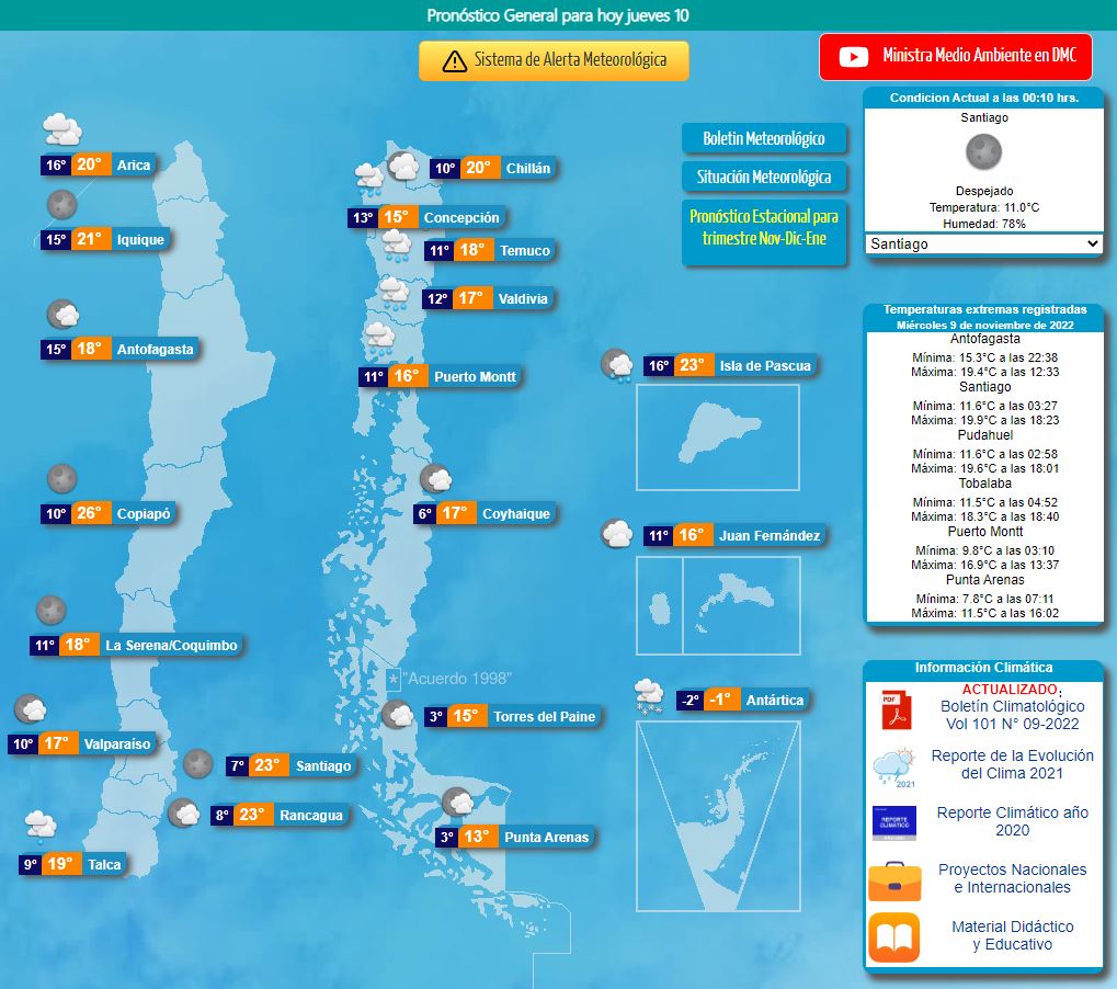 A continuación, te contamos cómo estarán las temperaturas durante este 10 de noviembre obtenidas a través del sitio oficial de la Dirección Meteorológica de Chile.
