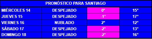 Este martes, Santiago Centro sumó el cuarto amanecer del año con heladas (-0,8°) y todo indica que estos registros se repetirán en lo que resta de la semana. “Sólo este viernes (16 de julio) estará nuboso en la capital, de hecho, ese día por la tarde aparece la opción de algunos chubascos débiles y locales en la capital, por lo que nos libraríamos de las heladas. Pero el resto de la semana seguiremos con heladas”, detalla Eduardo Sáez Brito, meteorólogo de Chilevisión.