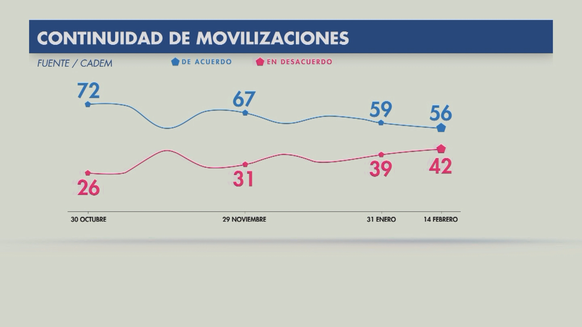 Si bien sigue siendo mayoritario el apoyo, un 56% está a favor de que continúen, este respaldo ha disminuido 16 puntos desde octubre cuando comenzó la crisis.
