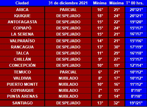 El siguiente es el pronóstico realizado por Eduardo Sáez, meteorólogo de Chilevisión, para este viernes 31 de diciembre y las temperaturas estimativas para la medianoche cuando recibamos el Año Nuevo: