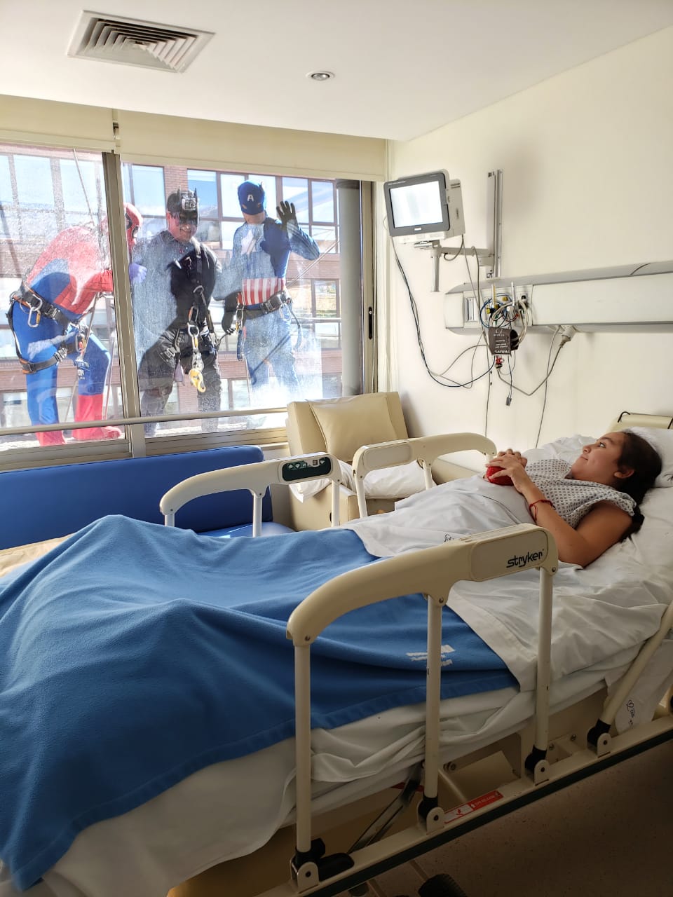 En la imagen enviada por su hermana Daniela, se aprecia como María Ignacia logró disfrutar este momento, en esta difícil etapa que está pasando. Mientras, estos tres trabajadores se encontraban con arnés y arriba del andamio.