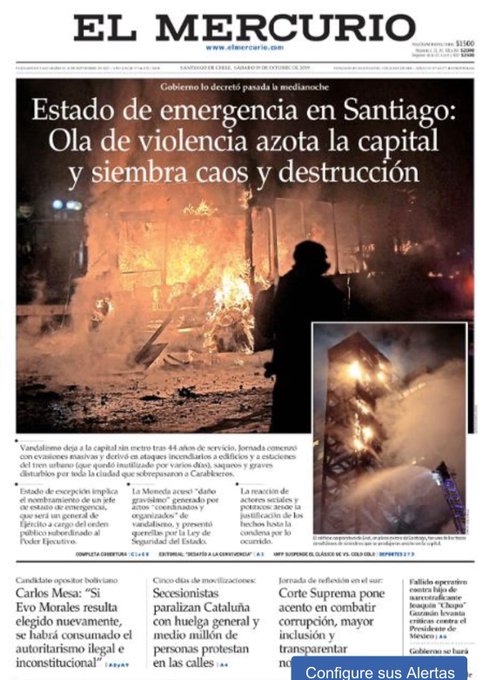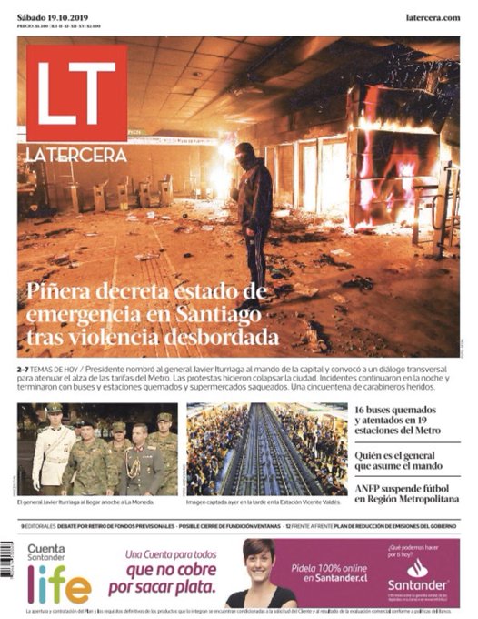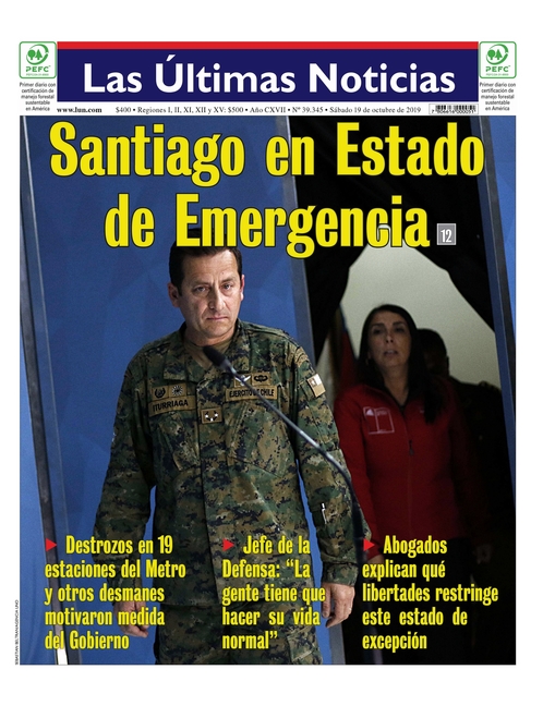 Por un lado, El Mercurio detalló lo ocurrido con un "ola de violencia azota a la capital y siembra caos y destrucción", resaltando la imagen de un bus incendiándose. En tanto, LUN fijó la imagen de Javier Iturriaga como Jefe de Defensa Nacional.