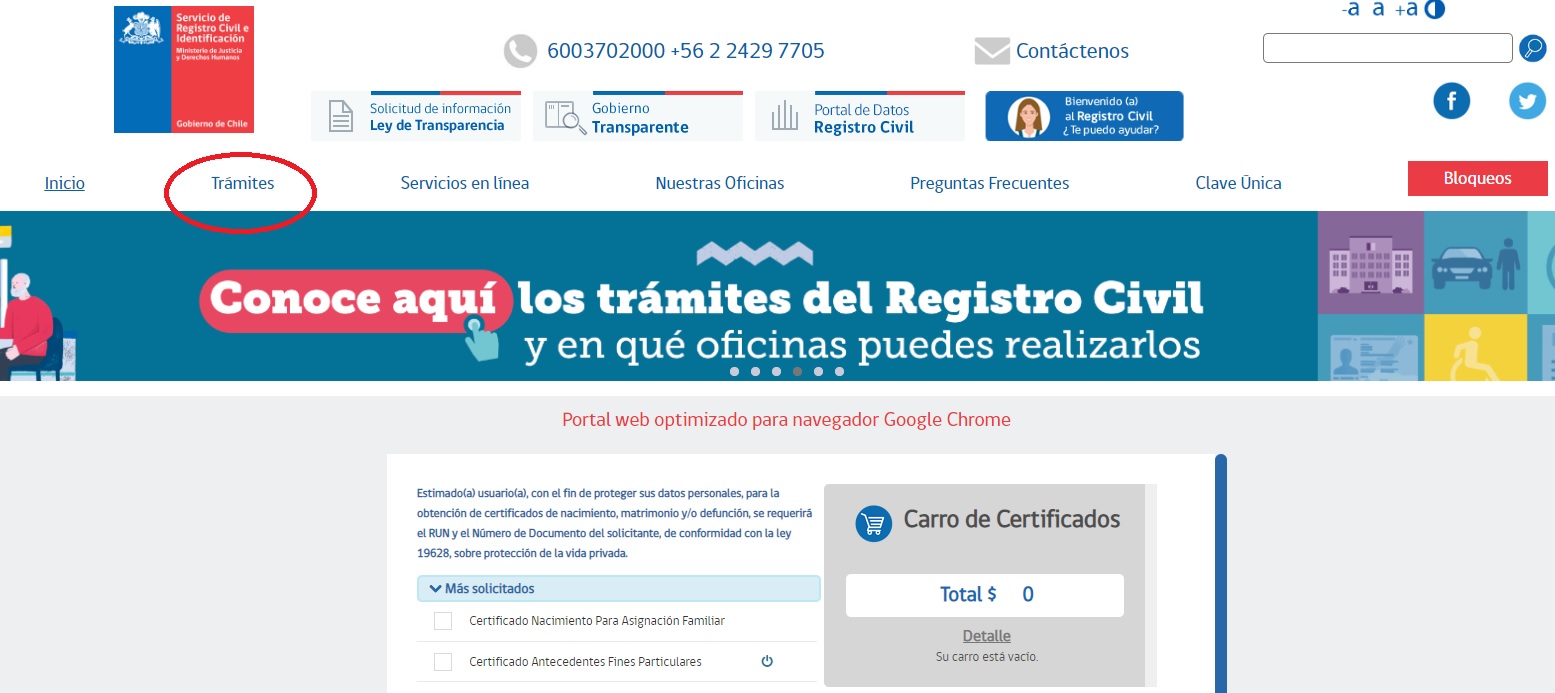 De acuerdo con Chile Atiende, para realizar el trámite debes dirigirte a una oficina del Registro Civil luego de haber agendado una hora vía web portando tu cédula de identidad vigente y en buen estado. Para reservar la hora, debes ingresar a la página oficial del registro civil pinchando este enlace. Una vez que ingreses al sitio web del Registro Civil, debes pinchar en "Trámites", botón que hemos encerrado en un círculo rojo en la siguiente imagen.