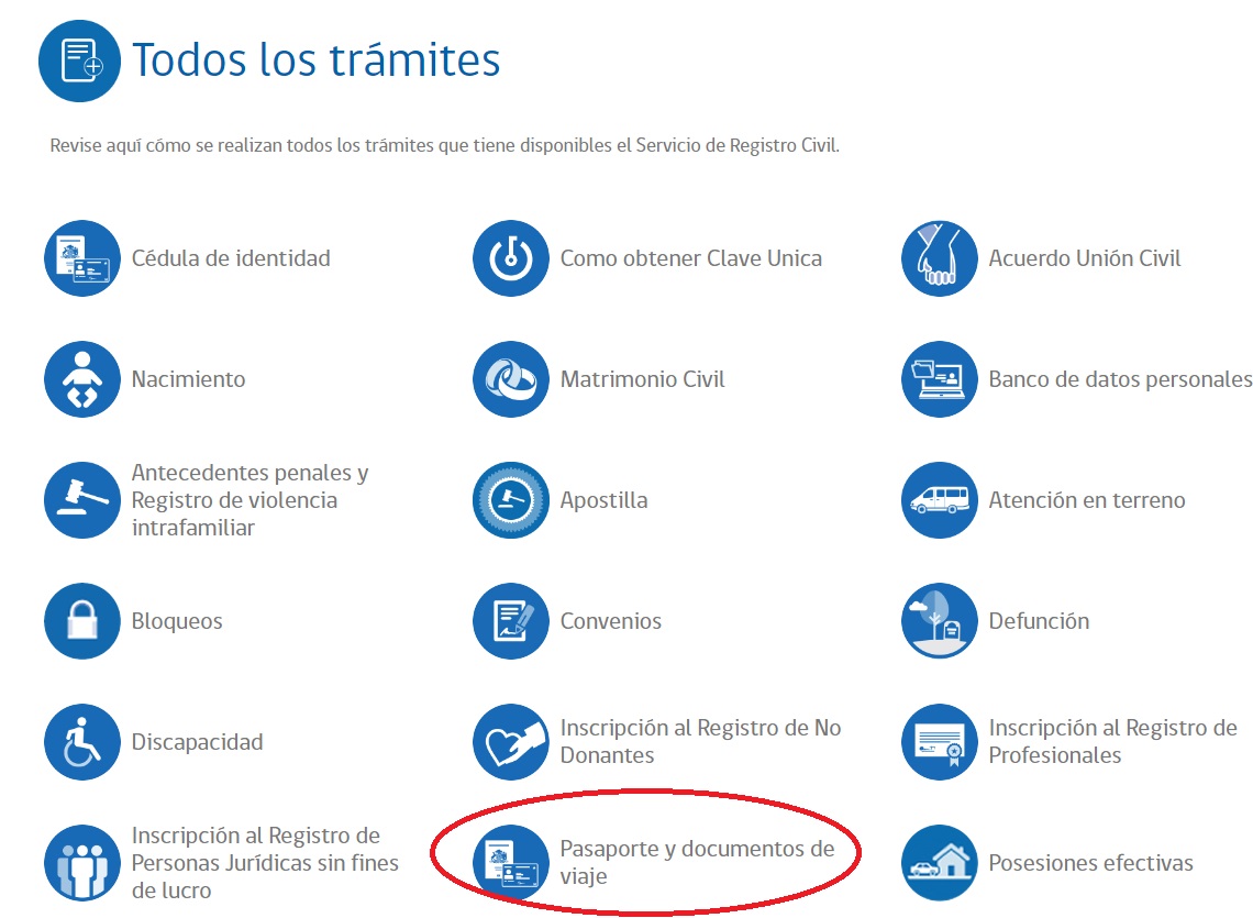 Luego, aparecerán una serie de opciones, pero debes hacer click en la que dice "pasaporte y documentos de viaje", que también podrás ver en la siguiente foto encerrada en una circunferencia roja.
