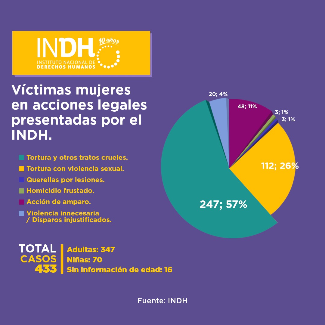 De un total de 433 casos de acciones legales presentadas por el INDH en que las víctimas son mujeres, 347 son adultas, 70 son niñas y de 16 no se tiene información sobre la edad.