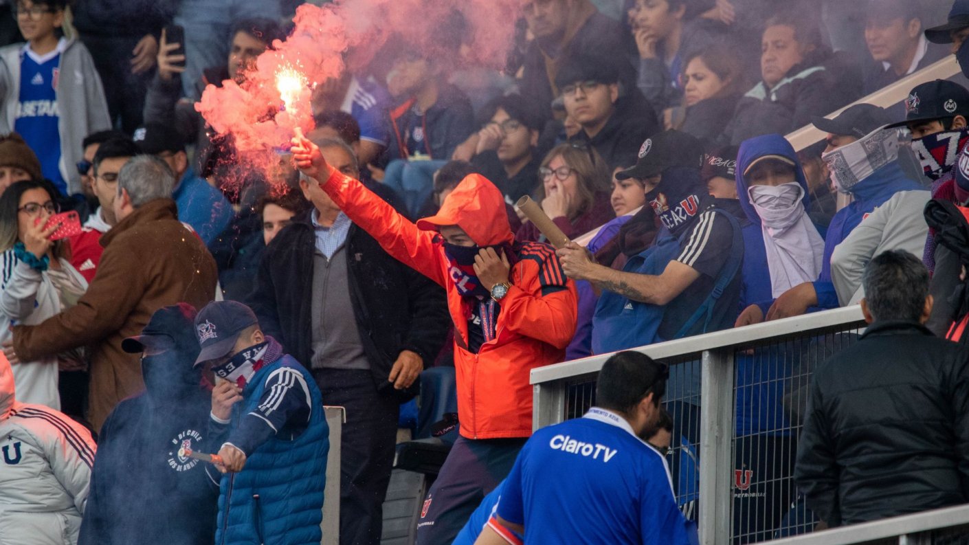 La edición 196 del clásico universitario disputado en el Estadio Ester Roa Rebolledo de Concepción debió suspenderse en el minuto 31', luego que barristas de los azules comenzaran a lanzar una gran cantidad de bengalas hacia la cancha.