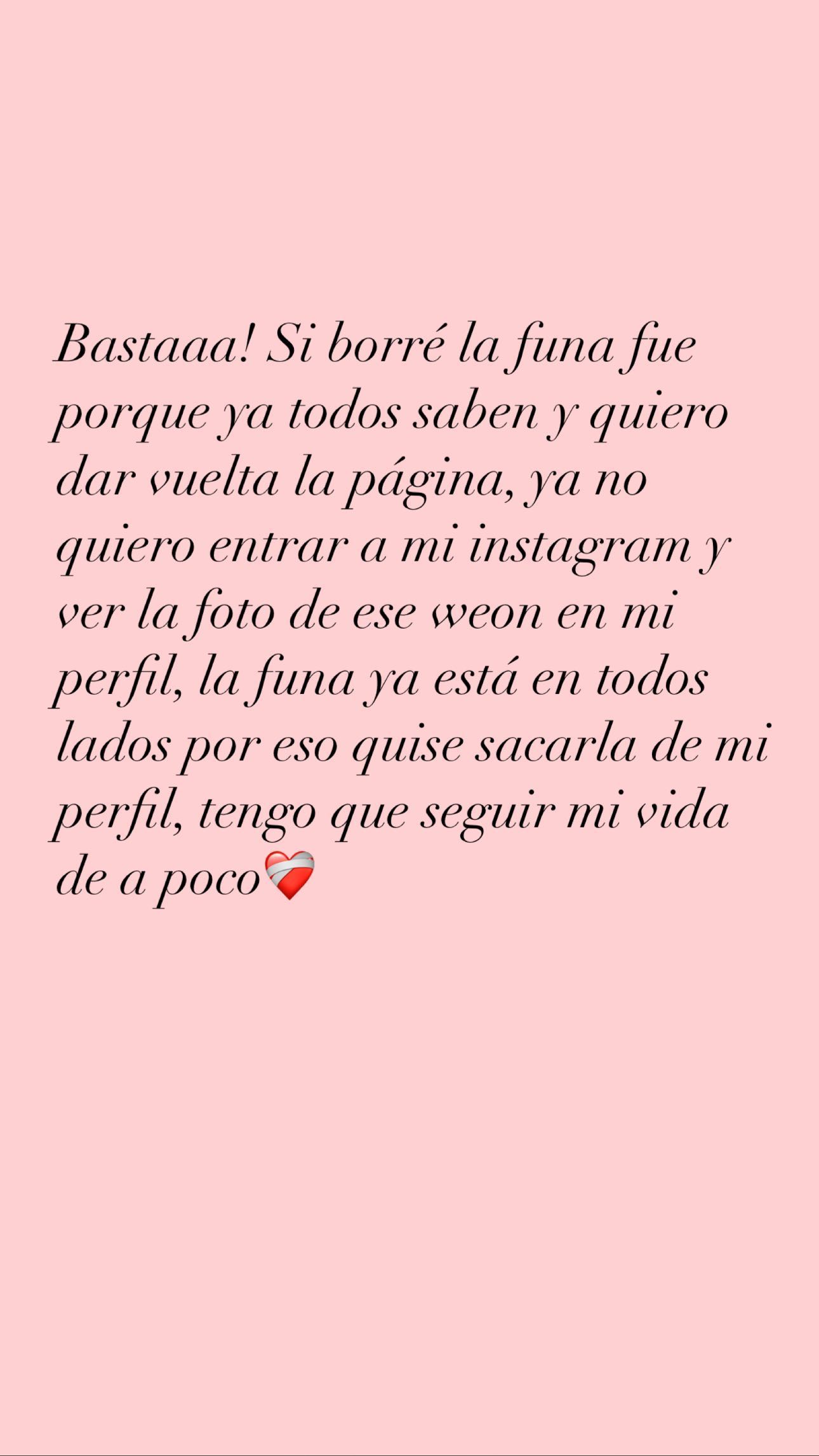 Si borré la funa fue porque ya todos saben y quiero dar vuelta la página. Ya no quiero entrar a mi Instagram y ver la foto de ese we... (sic) en mi perfil", señaló.
