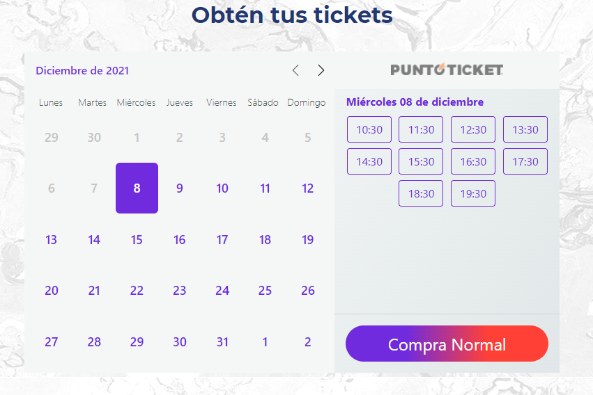Para comprar la entrada, es necesario seleccionar el día y la hora en que se desea ir. Luego de esto, debes hacer click en el botón Compra Normal y serás llevado/a a la plataforma para concretar la transacción.