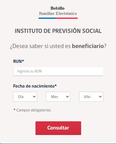 Averiguar si este aporte te corresponde es muy sencillo. Lo único que debes hacer es pulsar aquí y completar las casillas en blanco con tu RUT y tu fecha de nacimiento. Página oficial del Bolsillo Familiar Electrónico