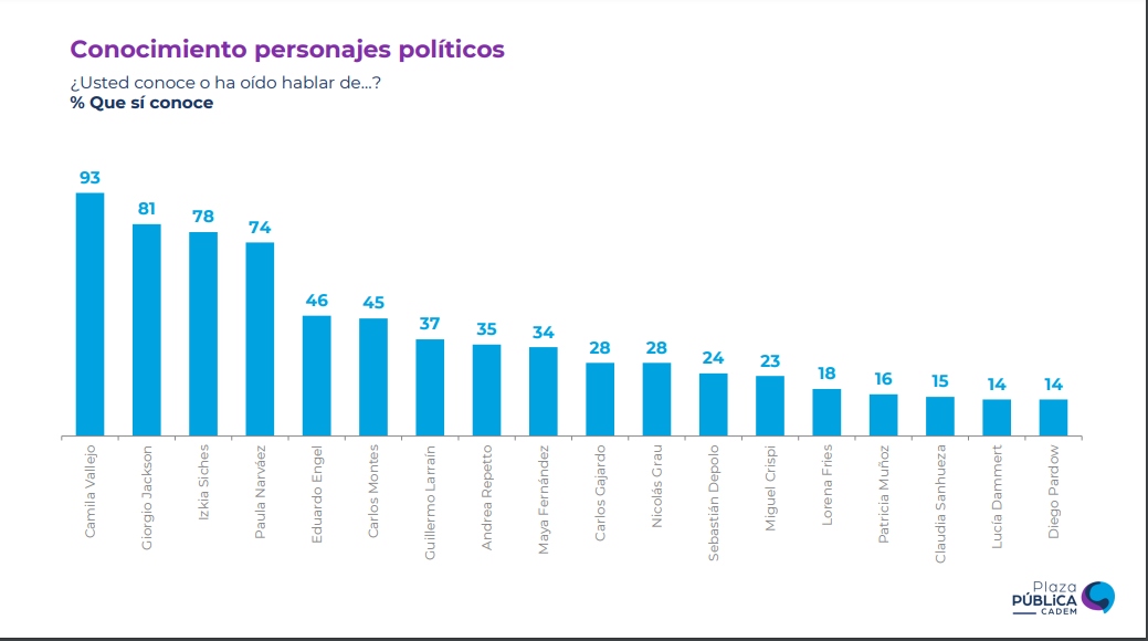 Lee también: Gabriel Boric envía saludo por fin de año y adelanta que "se vienen cosas buenas para Chile"Asimismo, personajes clave durante la campaña presidencial de Boric registran un alto conocimiento entre los encuestados. Tal es el caso de su ex jefa de campaña, Izkia Siches, quien alcanzó un 78%, el diputado Giorgio Jackson (RD) logró un 81% y la diputada Camila Vallejo (PC) llegó al 93%.
