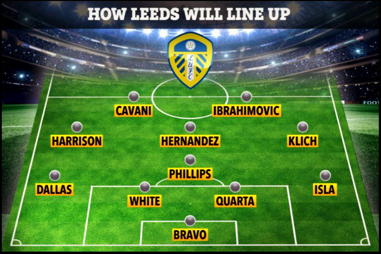 Claudio Bravo; Mauricio Isla, Martínez Quarta, Ben White, Stuart Dallas; Kalvin Phillips; Mateusz Klich, Pablo Hernández, Jack Harrison; Zlatan Ibrahimovic y Edinson Cavani.