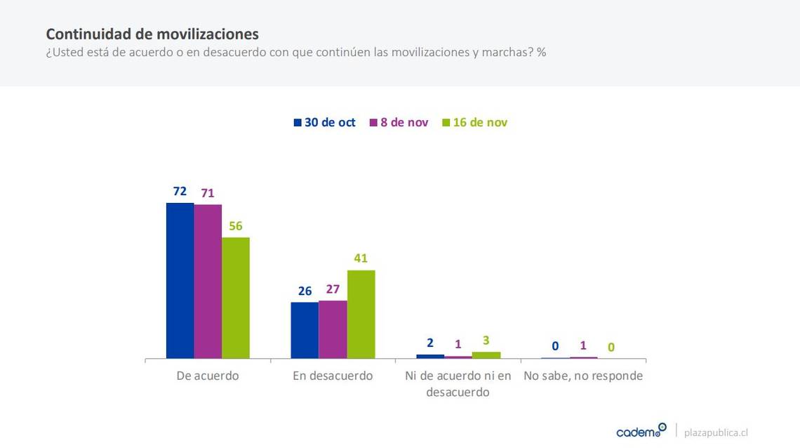 El informe de Cadem también muestra esta semana que el apoyo a la continuidad de las movilizaciones experimentó una considerable baja, pasando del 71% al 56%. En tanto, un 41% indicó estar en desacuerdo con que sigan las manifestaciones.