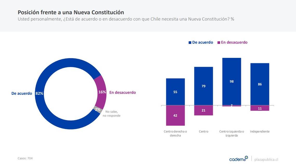 El respaldo aumenta respecto a la posición de los ciudadanos ante la creación de una nueva Carta Magna: el 82% afirma estar de acuerdo con que Chile necesita una Nueva Constitución y solo el 16% está en desacuerdo.