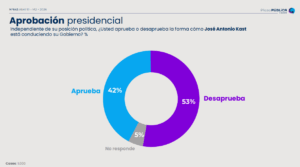 Tras los datos entregados en la evaluación, un 42% aprueba la gestión de Kast, lo que refleja una baja de dos puntos respecto a la revisión anterior. Además, un 53% la desaprueba.