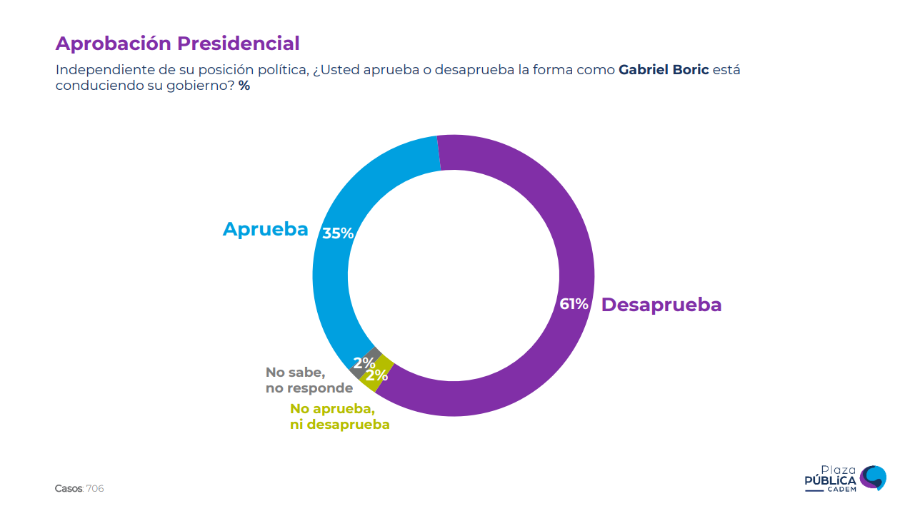 La última vez que el jefe de Estado había anotado una alta puntuación ocurrió el 26 de octubre de 2023, oportunidad en que alcanzó un 37% de aprobación.