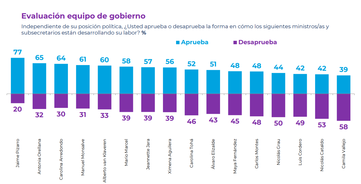 Jaime Pizarro (Deportes) se impuso como el ministro mejor evaluado del gabinete del presidente Gabriel Boric, mientras que Camila Vallejo (Segegob) obtuvo la aprobación más baja con un 39%.