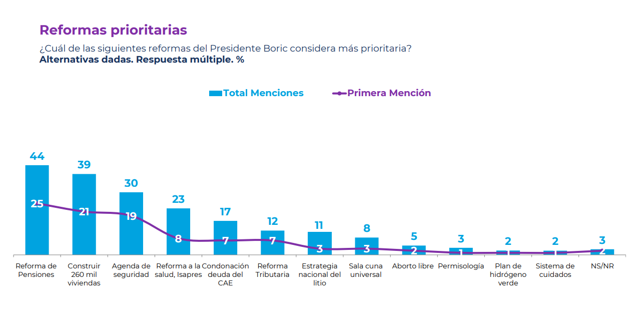El último sondeo de Cadem también preguntó a los encuestados "¿cuál de las siguientes reformas del presidente Boric considera más prioritaria?".