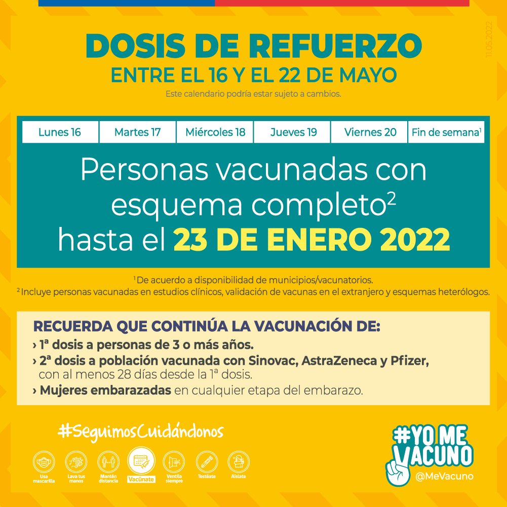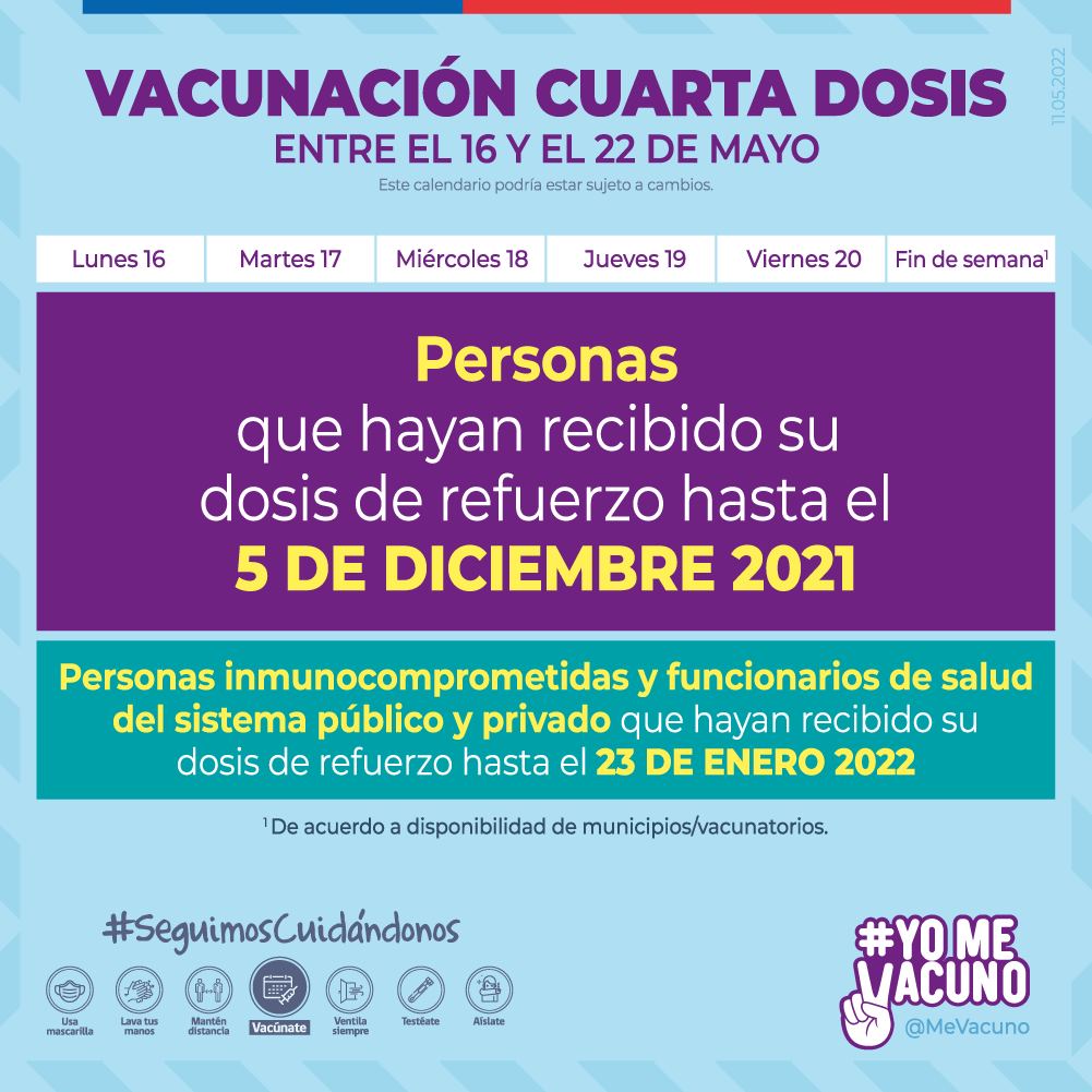 En cuanto a la cuarta dosis, a contar de este 16 de mayo pueden inmunizarse todas las personas que anteriormente hayan recibido su dosis de refuerzo hasta el 5 de diciembre del 2021.