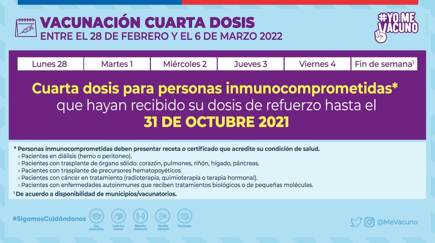 Lee también: Ministro de Economía asegura que se podría eliminar el Plan Paso a Paso si continúa la baja de casos por COVIDSegún lo informado por el Gobierno, la cuarta dosis para todos los mayores de 18 años se iniciará el próximo lunes 7 de marzo, siempre que hayan recibido su anterior dosis de refuerzo hasta el 12 de septiembre pasado.