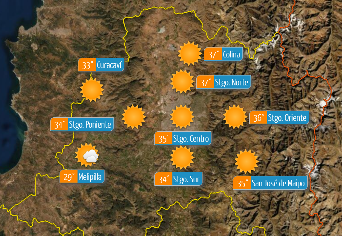 La capital no será la única zona afectada por esta ola de calor, puesto que en San Felipe y Los Andes podrían bordear los 38° y 39° como máxima. Lo mismo ocurrirá en otras ciudades como Rancagua (35°), Talca (36°) y Chillán (36°).