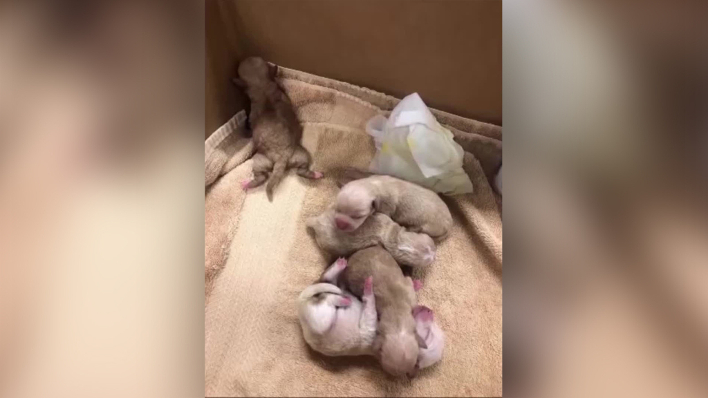 Un transeúnte descubrió la bolsa y un empleado de la tienda se comunicó con los servicios de animales. Los cachorros tenían alrededor de tres días y se creía que eran terrier mestizos, dijeron los servicios de animales.