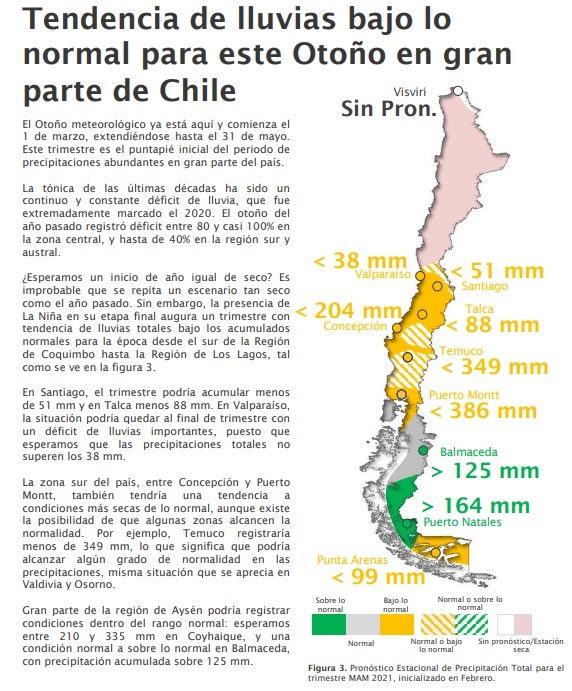 “En Santiago, el trimestre (marzo, abril y mayo) podría acumular menos de 51 milímetros de agua y en Talca menos 88. En Valparaíso, la situación podría quedar al final del trimestre con un déficit de lluvias importante, puesto que esperamos que las precipitaciones totales no superen los 38 milímetros”, anticipa el informe climatológico.