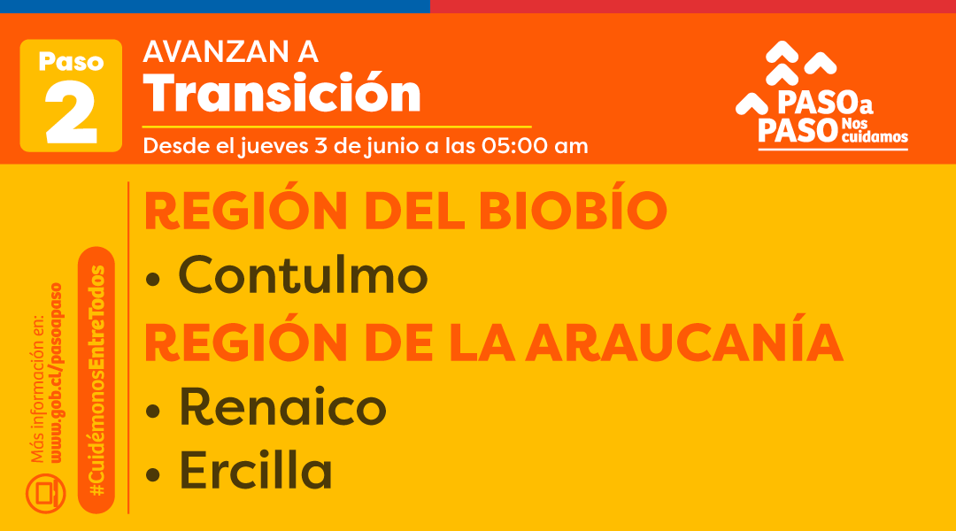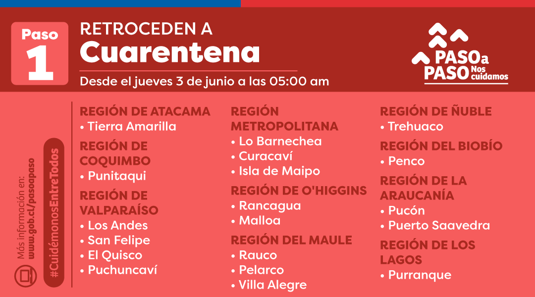 Lee también: Colmed tras salida de Mesa Social COVID-19: "Se implementan medidas que nadie sabe quiénes las toman"Desde el jueves 3 de junio a las 05:00 horas, 19 comunas retrocederán a Fase 1 de Cuarentena y 9 lo harán a Fase 2 de Transición. Además, tres comunas avanzan a Fase 2 y sólo una a Fase 3 de Preparación.