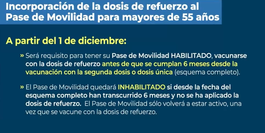 En ese sentido, la subsecretaria de Salud Pública, Paula Daza, informó que dentro de los nuevos lineamientos en lo que respecta al Pase de Movilidad para incentivar la vacunación en los mayores de 55 años, se encuentra que a partir del 1 de diciembre deberán estar inoculados con la dosis de refuerzo antes de que se cumplan seis meses desde que recibieron la segunda dosis, de lo contrario el documento sanitario será inhabilitado.