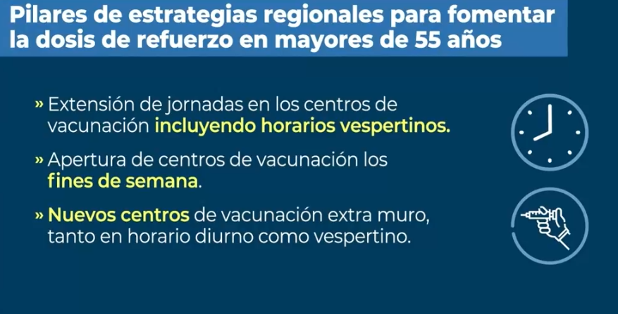 Por otro lado, Daza indicó que "con el fin de dar más facilidades para vacunarse, todos los Seremis de Salud están desplegando estrategias regionales" y adelantó que "hay tres acciones que se harán en la gran mayoría de ellos":