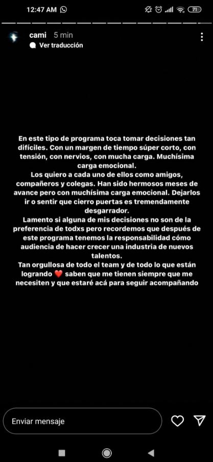 "Los quiero a cada uno de ellos como amigos, compañeros y colegas. Han sido hermosos meses de avance pero con muchísima carga emocional. Dejarlos ir o sentir que cierro puertas es tremendamente desgarrador", agregó la compositora, quien expresó que "lamento si alguna de mis decisiones no son de la preferencia de todxs, pero recordemos que después de este programa tenemos la responsabilidad como audiencia de hacer crecer una industria de nuevos talentos".